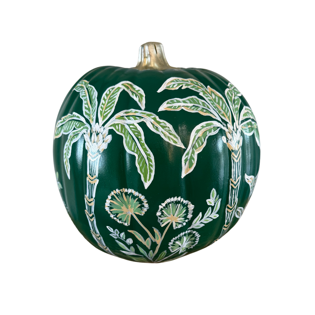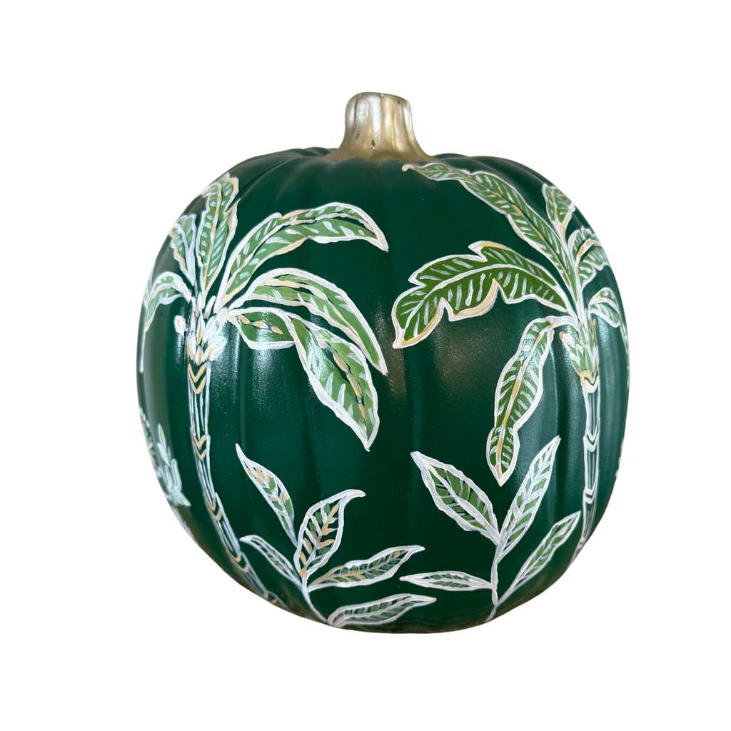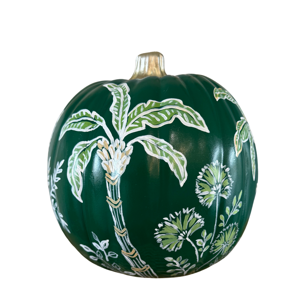 One of a kind hand painted 9" faux pumpkin. Palm pattern painted on dark green pumpkin