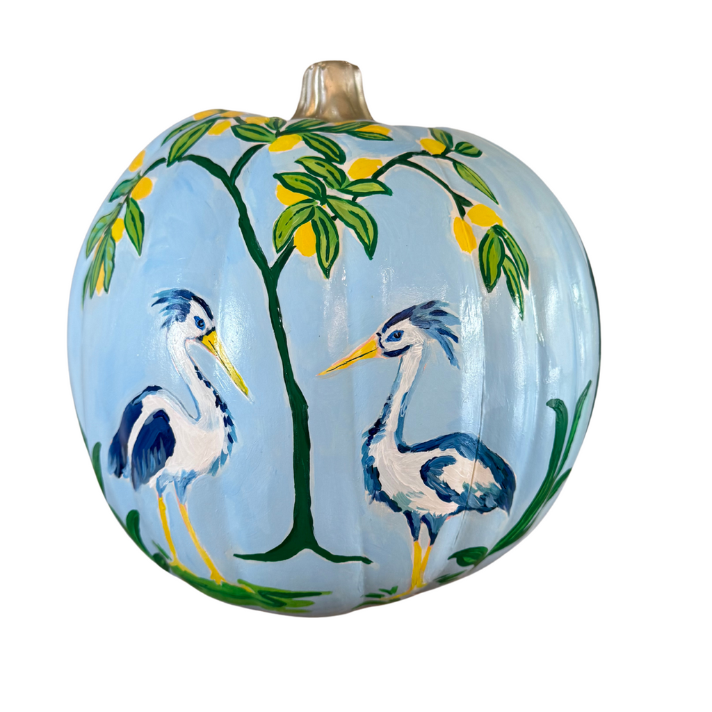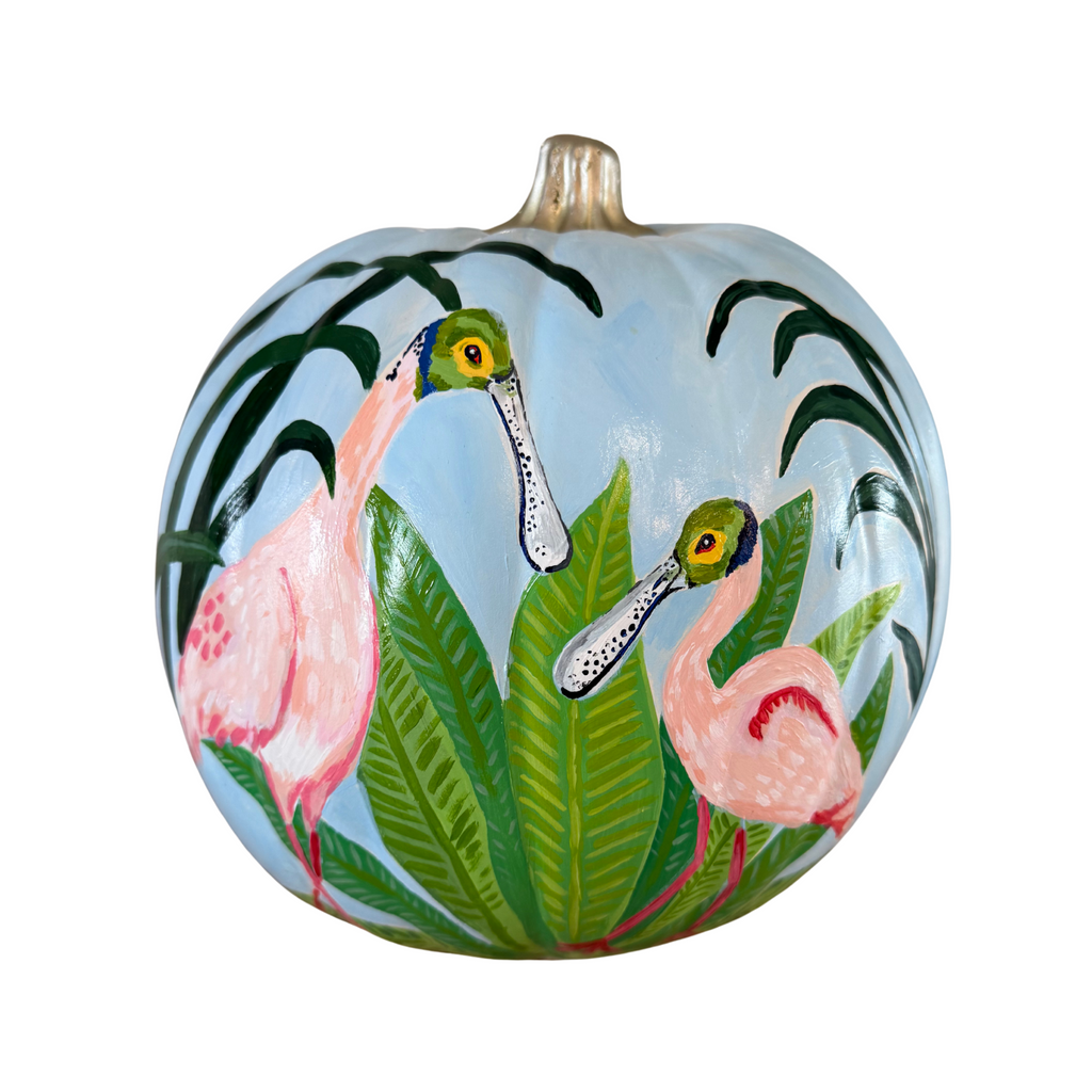 One of a kind hand painted 9" faux pumpkin. Roseate Spoonbills on one side, and Blue Herons on the other side